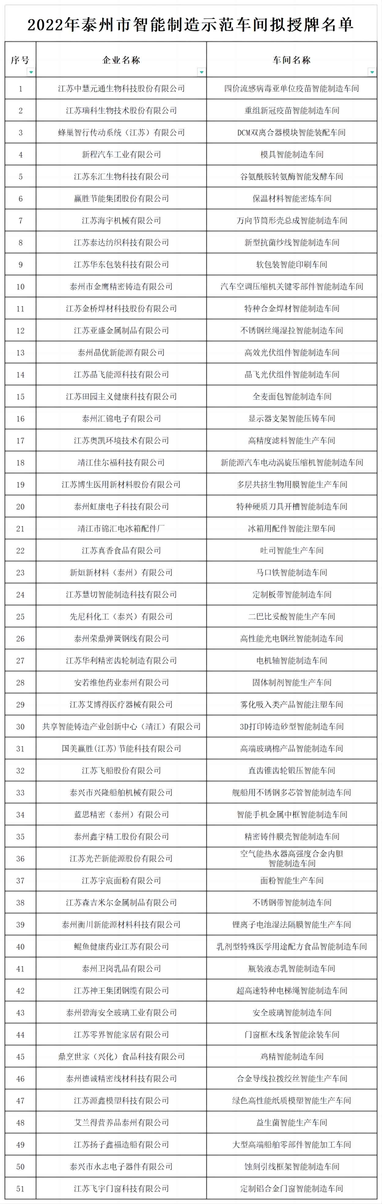 為鼓勵企業(yè)加大智能化改造投入力度,提升智能制造水平,根據(jù)《關(guān)于做好2022年市級智能制造示范車間申報工作的通知》(泰工信發(fā)〔2022〕109號),市工業(yè)和信息化局組織開展了2022年度市級智能制造示范車間認(rèn)定工作。經(jīng)企業(yè)申報、市(區(qū))推薦、形式審查、材料評審、現(xiàn)場核查、信用查詢等程序,擬對全市51家車間進行授牌,現(xiàn)予公示。