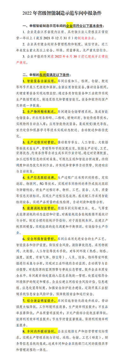 為深入貫徹省委、省政府關(guān)于加快推動(dòng)江蘇制造業(yè)高質(zhì)量發(fā)展走在前列的總體部署,認(rèn)真落實(shí)《江蘇省制造業(yè)智能化改造和數(shù)字化轉(zhuǎn)型三年行動(dòng)計(jì)劃(2022-2024年)》有關(guān)要求,引導(dǎo)企業(yè)加大智能化改造投入力度,切實(shí)提升企業(yè)智能制造水平,現(xiàn)就組織開展2022年省級(jí)智能制造示范車間申報(bào)工作有關(guān)事項(xiàng)通知如下: