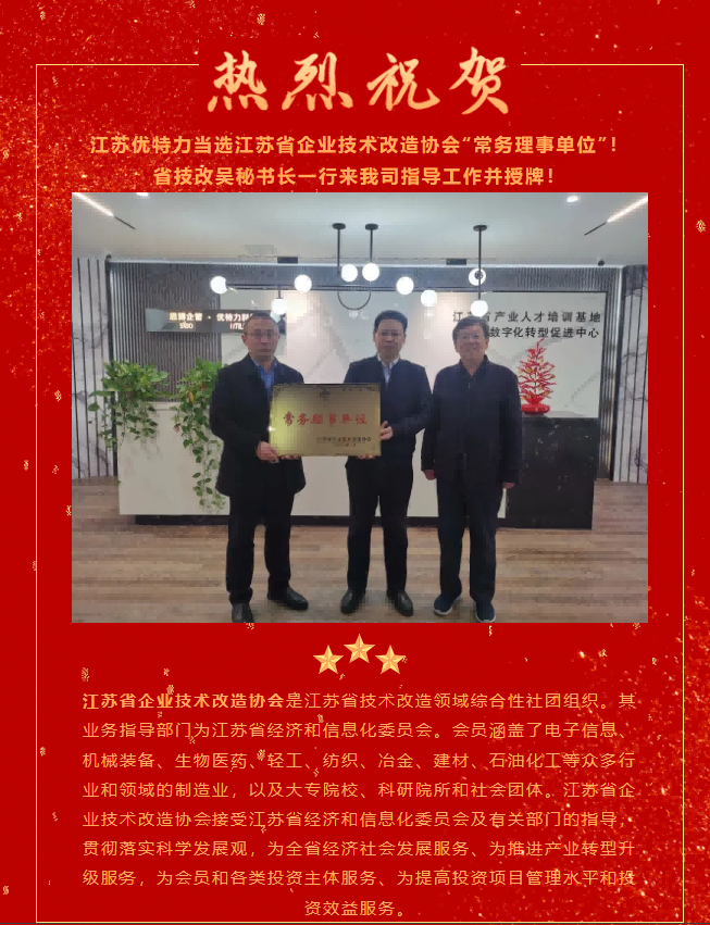 【喜報(bào)】江蘇優(yōu)特力當(dāng)選江蘇省企業(yè)技術(shù)改造協(xié)會“常務(wù)理事單位”!
